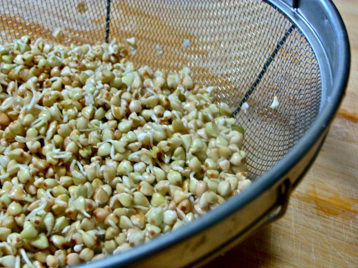 Sprouted buckwheat seeds are a great source of the vitamins, minerals and trace elements in buckwheat. Use a plastic or mason jar to store the buckwheat grouts in order to make them sprout. You can use a gauze sprouting top or make one from a plastic/mason jar lid with holes in. Add 3cm of water to the jar. Leave for 24 hours, remove water, then rinse and dry the seeds. Rinse and dry them 3 times a day until the roots sprout. Leave in a sieve (as below) to dry when sprouted. Store in a dry place. Add them into your salad for a yummy and nutritious topping! They are easily digested.
